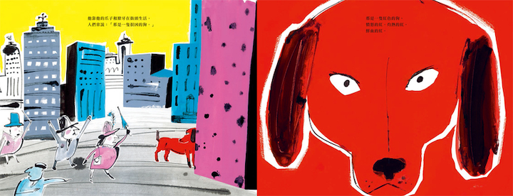 然而,《城市的狗》中的狗,因為流浪街頭歷盡凶險,也被人類傷得太深,不得不武裝自己的心;故事開始不久,文字便描寫牠的紅是憤怒的紅,灼熱的紅,鮮血的紅。牠的紅所象徵的,和Clifford截然不同。直到一個小女孩出現,紅色的狗雖然沒有立刻變得溫馴,但故事進行到最後,牠外在的紅依舊相同,內在早已退去了血氣,洗去了恨意,回應小女孩向牠展開的雙臂。