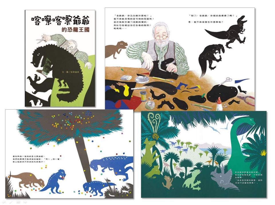 這是日本科學繪本大師松岡達英,第一次嘗試以剪紙來創作繪本,他在書中化身為老爺爺,伴隨著喀嚓喀嚓的剪紙聲,一隻隻活靈活現的恐龍躍然紙上!圖畫中的火山、森林、山川、昆蟲和鳥類,都是以大塊面的色紙剪貼,整本書的色彩和造型精彩極了。聽完故事,小孩也會忍不住想動手玩剪紙恐龍呢!