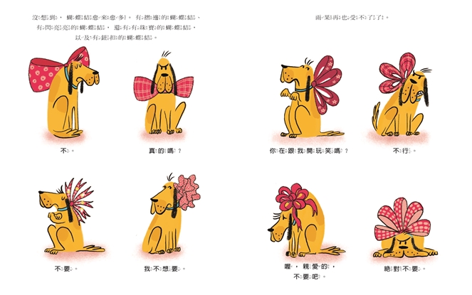 米莉喜歡用蝴蝶結來幫她的小狗雨果打扮,可是雨果不喜歡蝴蝶結。米莉準備了各式各樣的蝴蝶結,應有盡有,結果雨果用拉的、用扯的、用甩的,總想著要把蝴蝶結甩出去。在米莉(大人)的想要和雨果(孩子)的需要之間,要如何平衡呢?讓我們一起從閱讀中得到解方吧!