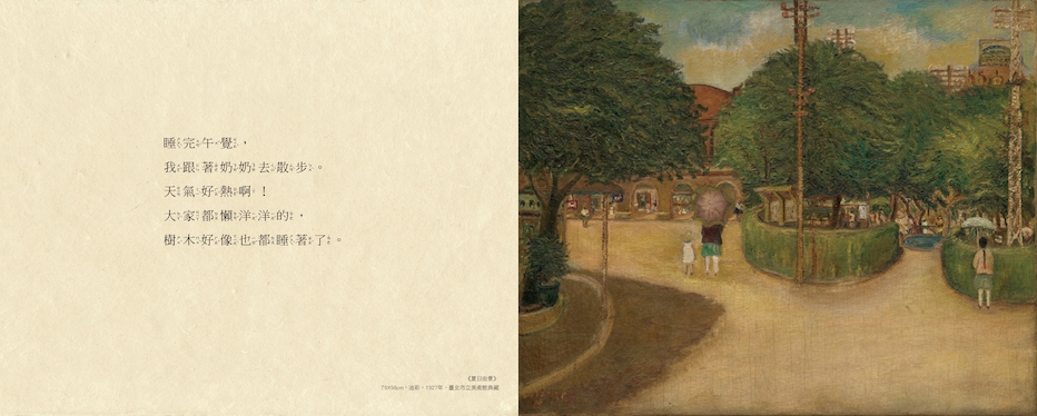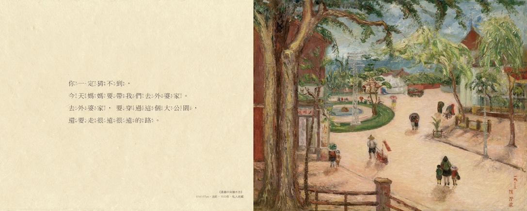 畫家陳澄波筆下的小女孩,輕輕巧巧地從《夏日街景》的午後,走進《嘉義遊園地》裡的綠色國度,尋找嬉戲的丹頂鶴和調皮的猴子,又從《新樓風景》裡的紅瓦洋樓放學,踏入《九月城隍祭典》的熱鬧廟會……咦?那相似的樓房窗格,好像在哪兒見過!噓,這棵樹好像在伸懶腰……嗯?這會兒急忙穿過公園的戴帽女孩,她又要去哪兒?