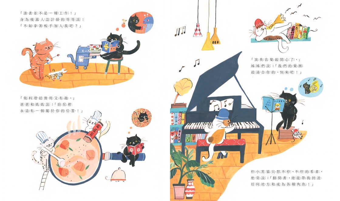 來自名貓家族的小黑貓,他的家人們擅長各式各樣的工作,有出名的抓鼠高手、舞者,還有甜點師傅,但是,不論家人們如何邀請小黑貓加入他們的行列,他都只想要不停、不停的看書。