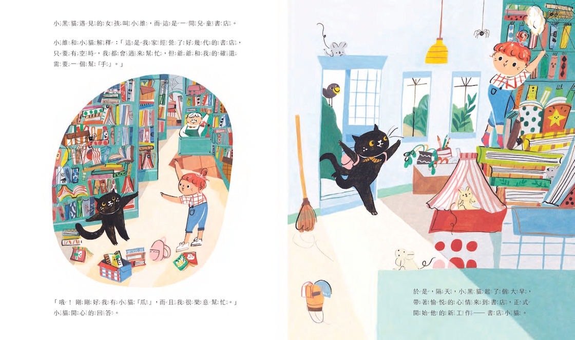 兒童小書店自從有小黑貓的加入後,變得熱鬧又忙碌,書店小貓正做著他最喜歡的事,一邊照顧小書店的每一個角落,一邊咻咻的搖著尾巴,當然,更重要的是,幫每位小朋友找到最適合他們的書,然後,發出滿足的呼嚕呼嚕聲。