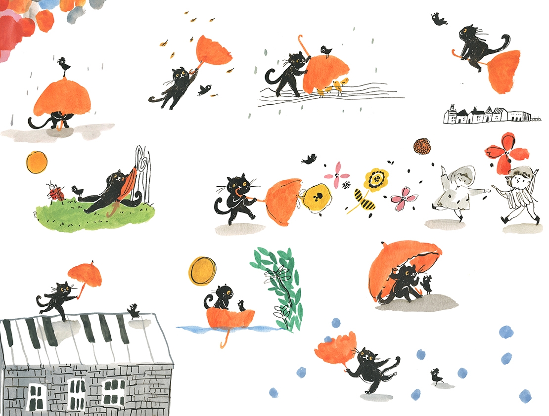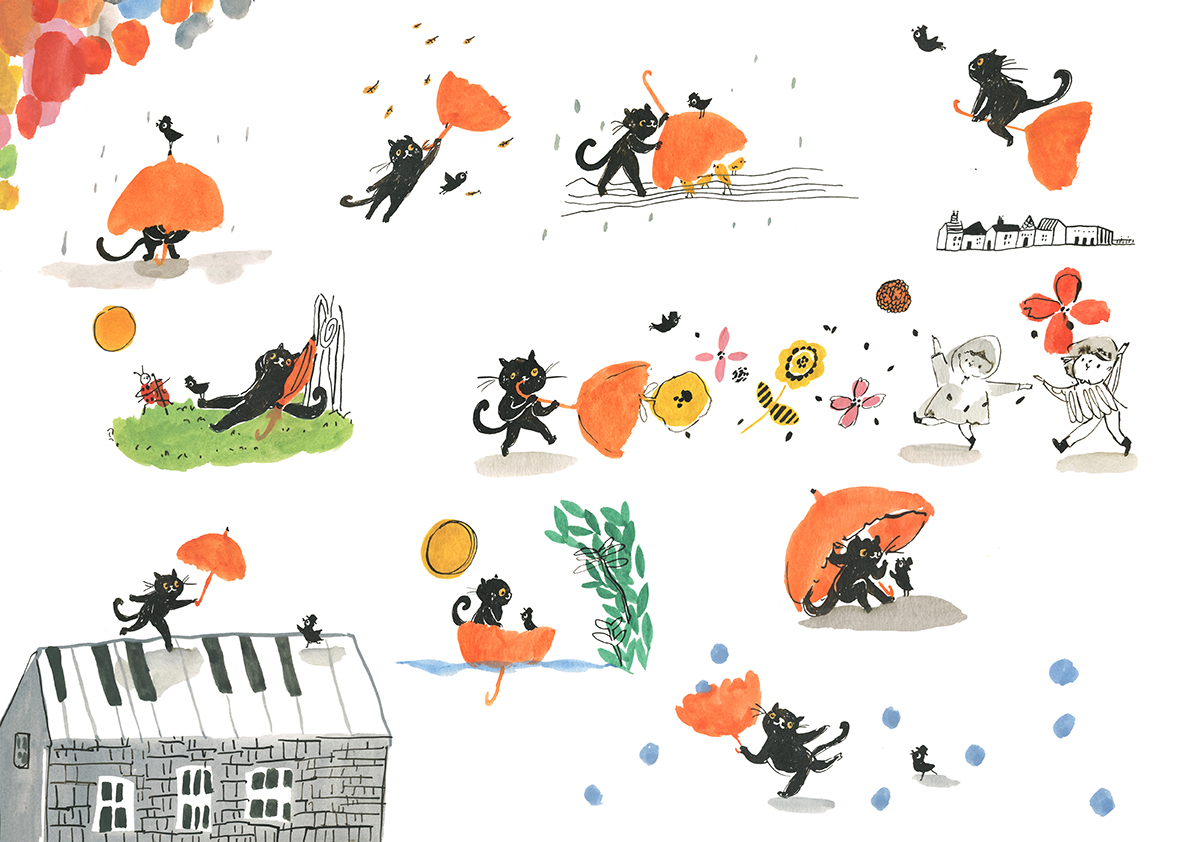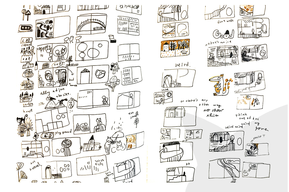 繪製草圖時,很喜歡先在sketchbook上自由發想構圖,先不設限於故事設定或是版型,就是自由的發想各種可能,然後從眾多小格子裡面選出適合的圖像,再嘗試做更細節去配合故事的設定,至於角色部分,因這本書除了小黑貓以外,還有貓家人、書店主人及小維,我也是先在sketchbook裡慢慢發展角色形象,因對貓咪已經有一定程度掌握和人物是過往比較有繪製經驗的,所以這塊相對也較快達成。