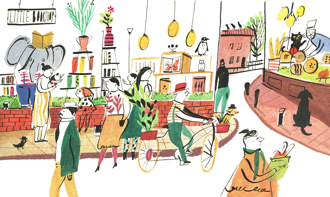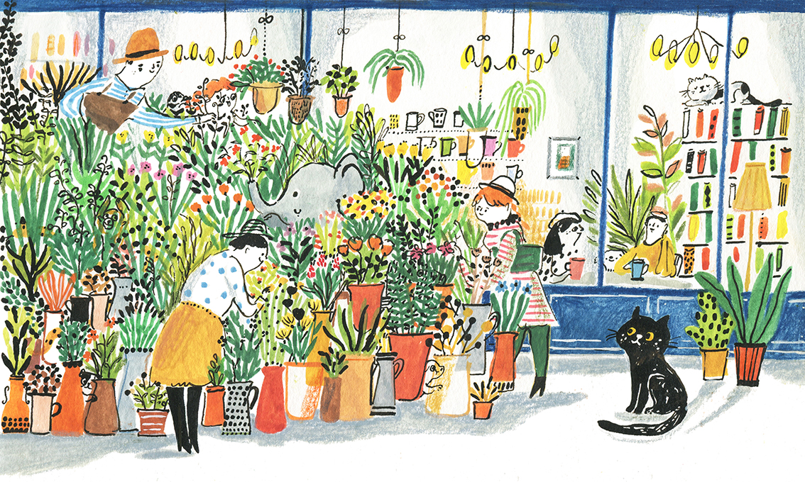 繪製彩圖時還算順利,第一張繪製的是小朋友們回到小書店看書的一頁,很喜歡在畫圖時加上一些文字沒提到的細節,像是特別設定是女生玩機器人,或是小男生玩紙娃娃的圖像,去跳脫傳統對於性別的刻板印象,或是書中有一隻小黑鳥和一群老鼠,也是書店小貓的朋友,幾乎在每一頁都能看到他們的身影,讓讀者能同時享受尋找他們的樂趣,而每次繪製空間時,初衷都會是這是我也想進入的地方,自己理想中的繪本書店,會是如書中ㄧ樣,是一個溫暖和充滿歡樂的空間,小朋友們都能在這裡找到自己喜歡的書。