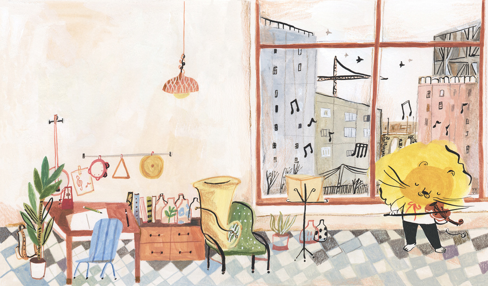 我的筆電桌面是一隻正在拉小提琴的獅子,一眼就喜歡上那頭蓬鬆的金髮,邊際勾勒的粗短黑線和窗玻璃上的躍動音符,起了點睛的效果,彷彿能聽見樂音,不禁想跟著律動搖擺。小獅子閉著眼陶醉演奏的模樣,背後明亮的窗映著城市景致,而房間裡的擺設,盆栽、樂器、書桌、紙筆,方格地板交織著黑灰藍白,滿是質地與美感的生活氣息,格外鮮明。這幅跨頁的左半為靜穩定調,配上右半頁的沈醉滿足,物質與精神生活兼然,正是我嚮往的生活樣貌。