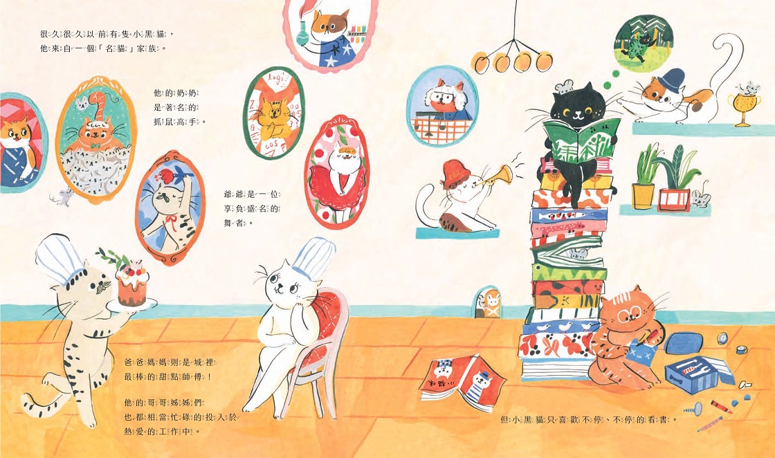 來自名貓家族的小黑貓,他的家人們擅長各式各樣的工作,有出名的抓鼠高手、舞者,還有甜點師傅,但是,不論家人們如何邀請小黑貓加入他們的行列,他都只想要不停、不停的看書。