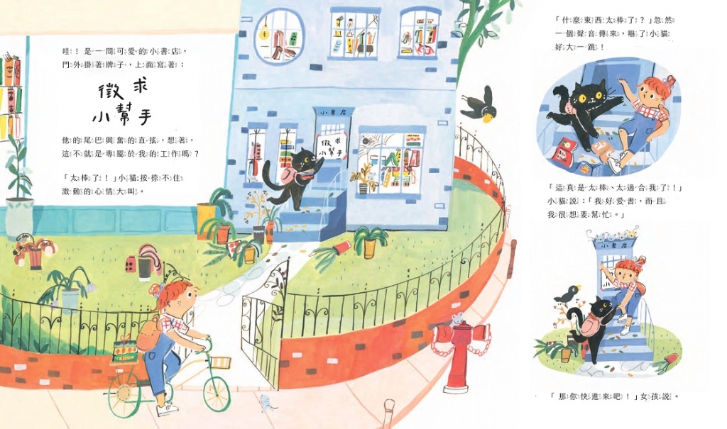 兒童小書店自從有小黑貓的加入後,變得熱鬧又忙碌,書店小貓正做著他最喜歡的事,一邊照顧小書店的每一個角落,一邊咻咻的搖著尾巴,當然,更重要的是,幫每位小朋友找到最適合他們的書,然後,發出滿足的呼嚕呼嚕聲。