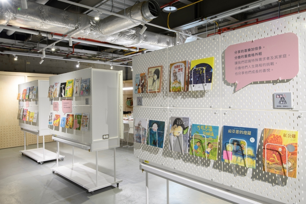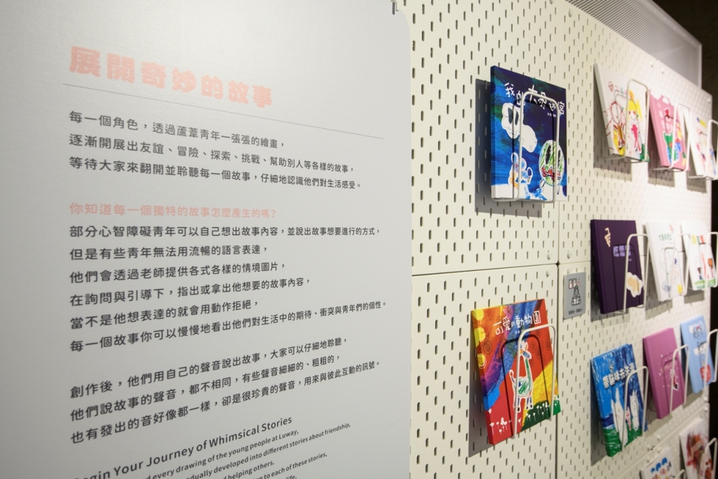 藝術共融繪本展每一個繪本角色就如同自我投射,找到屬於自己的特質,逐步展開各種奇想的故事,蘆葦青年因不同身心特殊需求,藉由使用輔具進行個人繪本創作,讓所創作出的圖像成為語言符號,傳達個人的想法;心智障礙青年雖不諳表達,但其內心世界的感受同樣多彩多姿、有笑有淚,也期望與人有關係的建立,以及各種情緒的反應。