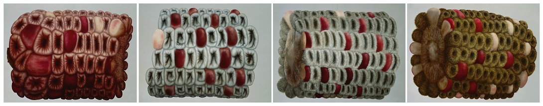 《住宿》是藝術家黃薇珉的一組四聯幅油畫,以皮肉、棉被、皮草、乾草四種物質,組構出一個巨大的玉米造型居所。靈感來自黃薇珉的一段奇想,「如果我是一隻小螞蟻,能夠住在一個大玉米裡,富饒風裕,安全無虞,那該有多好…」。想像自己是一隻小螞蟻,置身於這些巨幅畫面之中居住、移動,觸感不同、溫度不同、顏色也就不同,就像是提供人們安全感的住所,人就寄生在玉米粒的小宇宙裡。