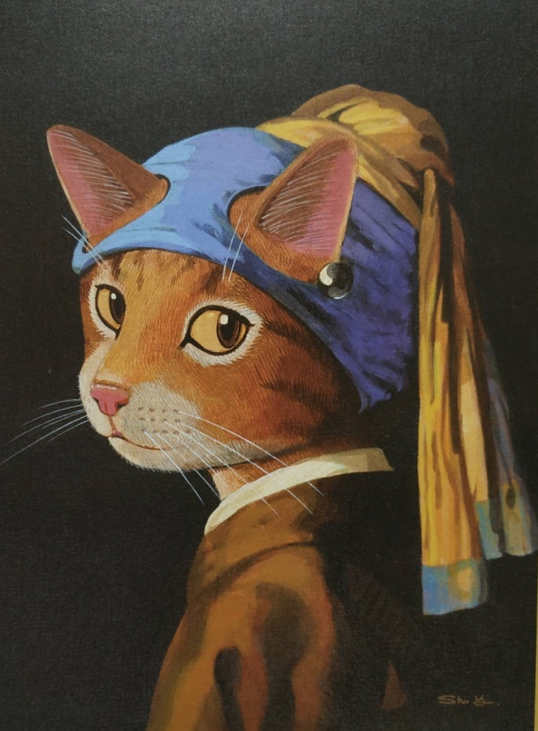 其實談到藝術流派的各種再製表現,還可以和小朋友們分享2019年6月21至2019年9月15日期間在臺北花博公園流行館展出的展覽《貓美術館–CAT ART世界名畫展》,已經持續十幾年喵畫創作的日本知名畫家山本修老師,將許多經典名畫的主角們全面貓化!展出內容集結了古代藝術文明、文藝復興、巴洛克、新古典主義、寫實主義、印象派、20世紀美術、亞洲藝術等時期的藝術作品。在此分享《戴珍珠耳環的少女貓》(圖9)來呼應賽巴斯汀 · 休默頓的作品(圖10)作為本文的句點。
