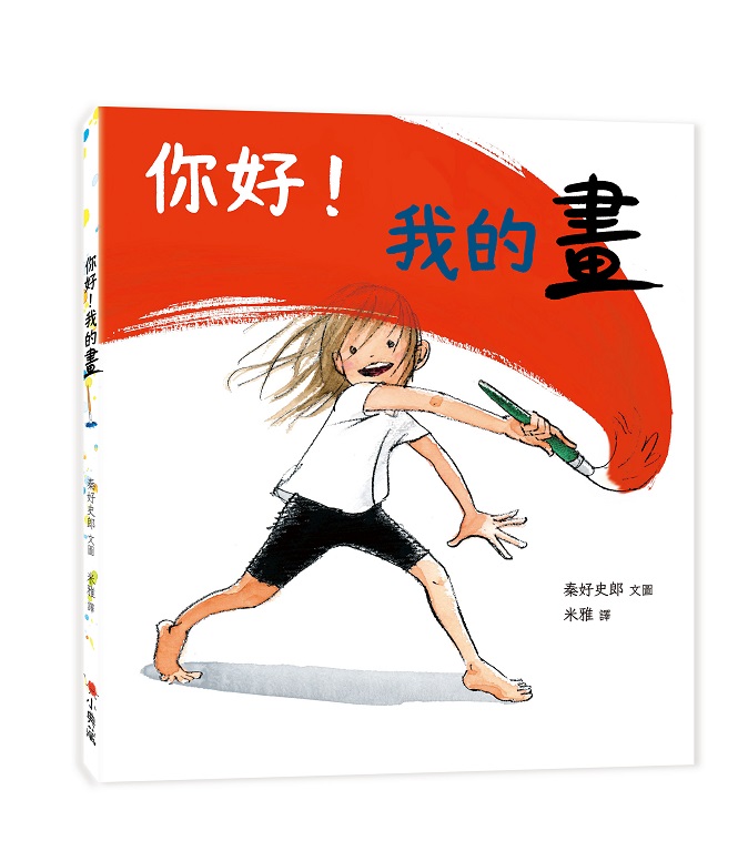這件作品讓我聯想到小典藏即將出版的繪本【你好!我的畫】(圖8),作者為出生於日本的繪本作家插畫家:秦好史郎,故事中的小女孩一開始拿著畫筆及水桶在白紙上盡情的畫著,愈畫愈開心,後來還將雙手雙腳當成畫筆繼續不斷畫,除了調出更多顏色,還利用身體的動感產生出不同的點、各種粗細不同的線條、多變化的曲線……為一大片的白底,帶來豐富的樣貌,發現畫畫可以是輕鬆又有趣。這個藝術活動很適合初夏,地點可以在家中的浴室,將一張全開白色美術紙貼在牆上及地上,可參考賽巴斯汀 · 休默頓的作品,痛快的畫上顏色後,後製剪貼成一件作品,多適合拿來布置在書房裡呀!