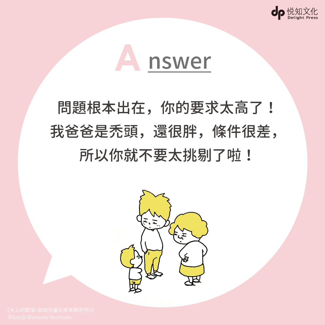 即使沒辦法符合你所有的要求,只要符合三項,就已經很好了啊!你的問題根本出在,要求太高了!我爸爸是禿頭,還很胖,條件很差,我媽媽也說:「因為找不到更好的,才會嫁給爸爸。」所以你就不要太挑剔了啦!