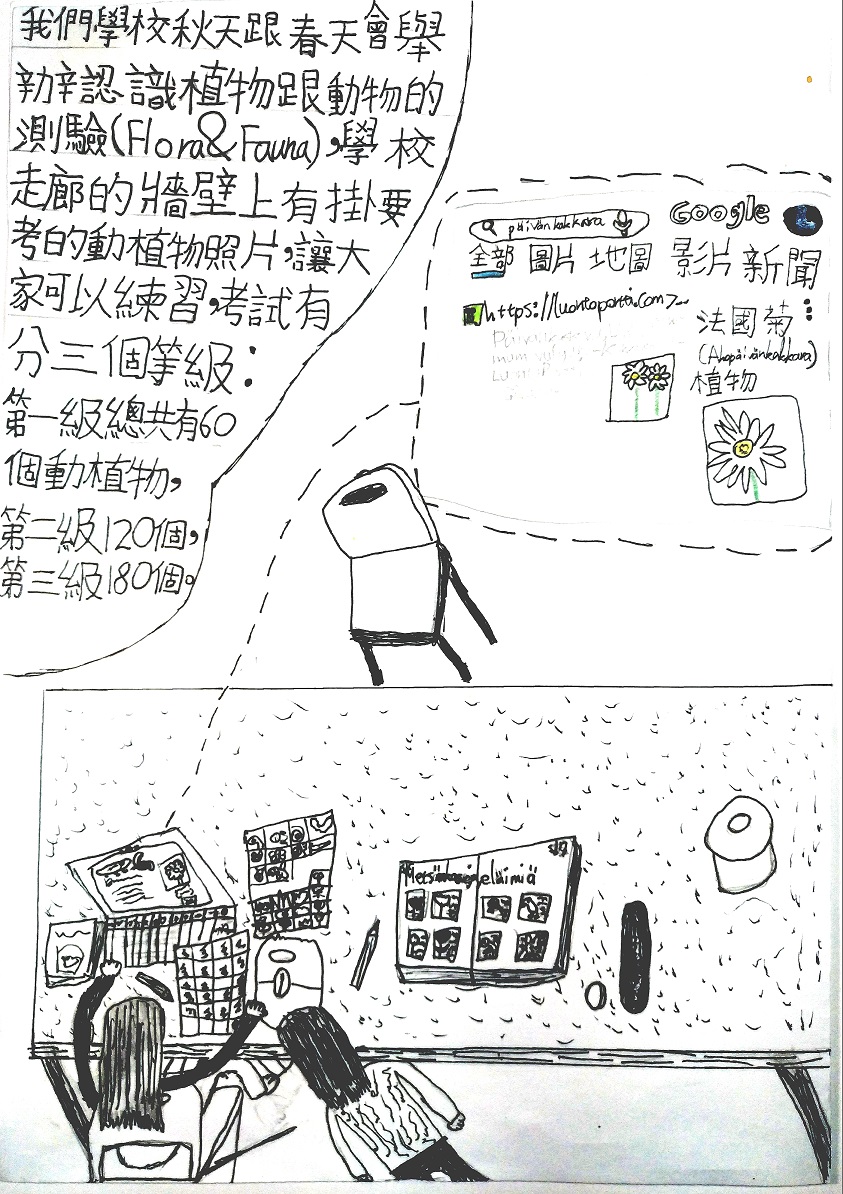 我們學校秋天跟春天會舉辦認識植物跟動物的測驗(Flora&Fauna),學校走廊的牆壁上有掛要考的動植物照片,讓大家可以練習,考試有分三個等級:第一級總共有60個動植物,第二級120個,第三級180個。