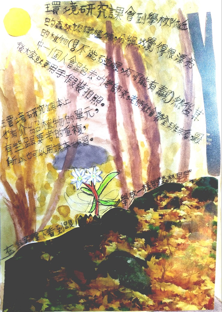 環境研究課會到學校附近的森林認識植物,分組找覺得很漂亮的植物(!不能碰喔,有可能有毒!),然後其中一個人會跑去叫老師來,老師就會帶全班來看,最後大家就要用手假裝拍照。環境研究課本上也有介紹植物的單元,有些跟要考的重複,所以也可以用課本練習。