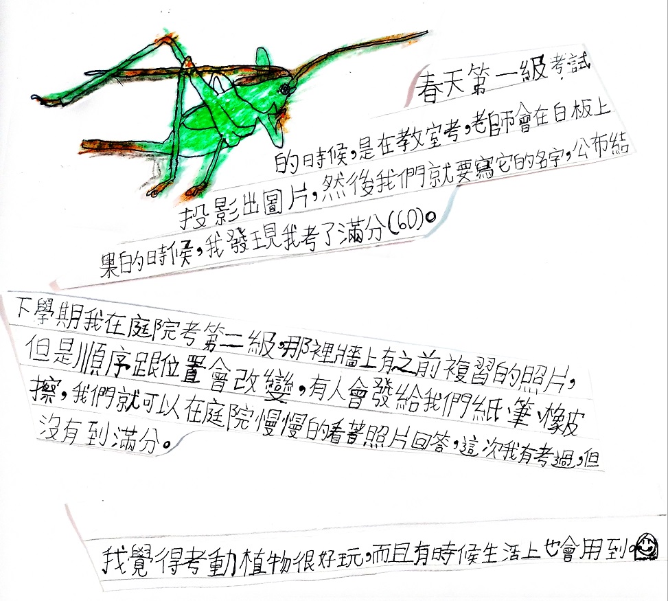 下學期我在庭院考第二級,那裡牆上有之前複習的照片,但是順序跟位置會改變,有人會發給我們紙、筆、橡皮擦,我們就可以在庭院慢慢的看著照片回答,這次我有考過,但沒有到滿分。
