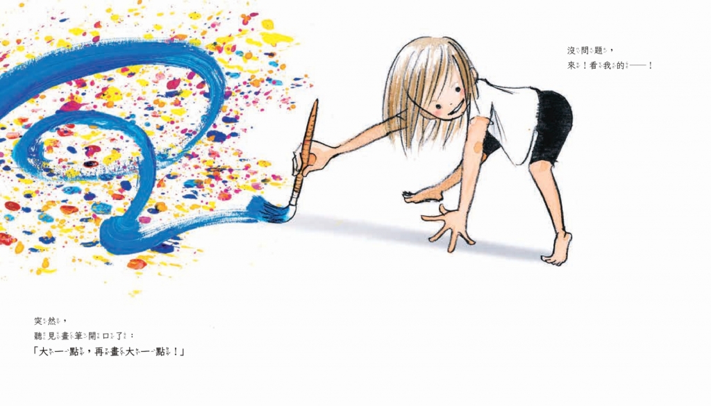 巧妙的是,孩子最初在一片「白」上開始做畫,作者並沒有特意強調那是「畫紙」,或是「畫布」。當五感打開,我的身體、我自身就是筆,整個世界和生活都是我的畫紙和畫布,可以縱情揮灑。此時無筆勝有筆,無紙勝有紙;無所不能作畫,無所不能畫。