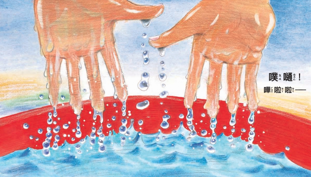 千變萬化,捉摸不定的水,在他多部作品中皆有多元又精采的呈現。如果讀過他所插圖的《為 淅瀝嘩拉下大雨》,就會知道他是如何擅長表現難度極高的水的各種樣貌。