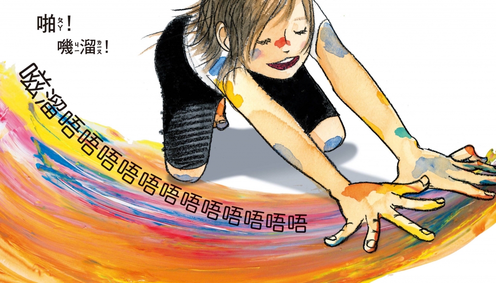 畫面與文字時而聚焦特寫孩子的手指、腳掌,呈現與顏料互動時的觸感,時而拉遠表現孩子與畫作/間的互動愉悅。而從畫筆所能表現的點、直線、弧線、圈圈,滴淌,到用四肢進行塗抹、近似青蛙游泳爬行、甚至奔跑……從筆刷、到手指、到腳底,到全身;從畫筆、到水桶和水、從小面積做畫擴大到塗滿整個大空間,甚至整個世界……秦好史郎不斷打開畫畫的感受維度。