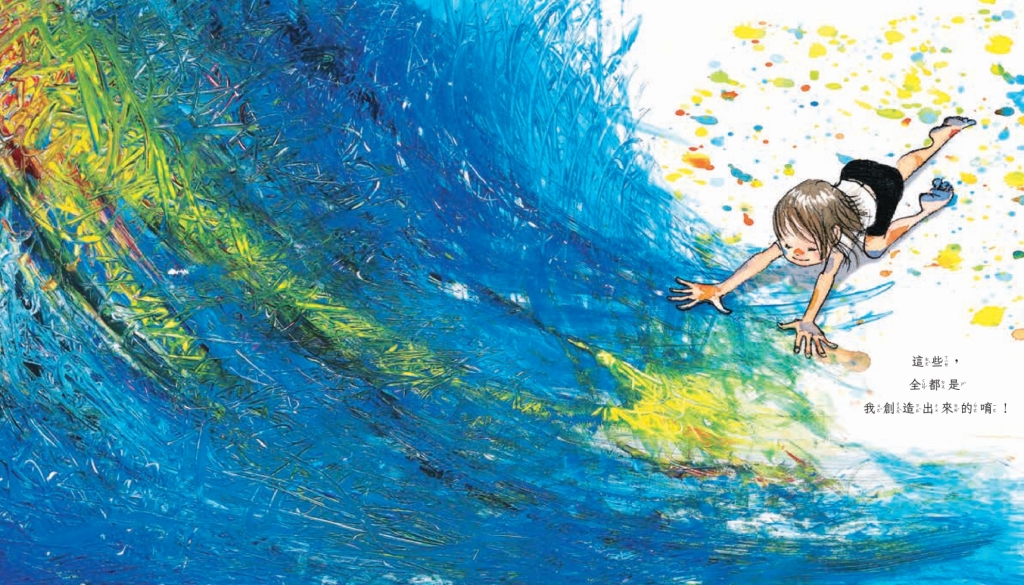 書中的孩子傾聽著心的呼喚。他打開五感,並且不斷延伸出去,界線與限制不斷消失。用全身去感覺,用全身去作畫,沒有任何的技巧限制,進入一種全身而入,人筆合一的忘我境界。