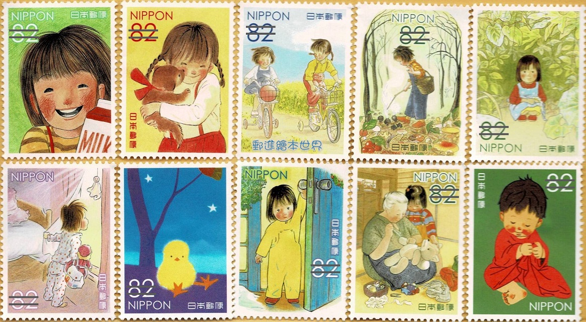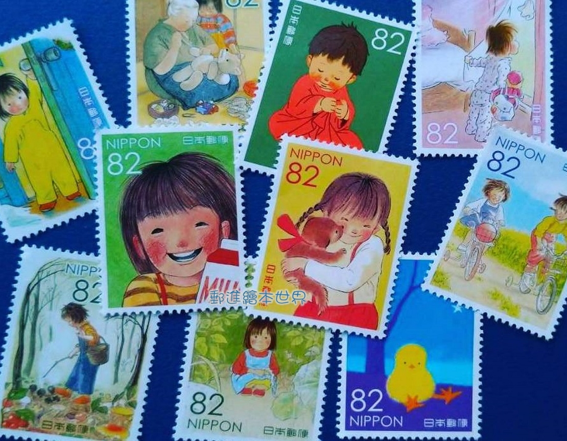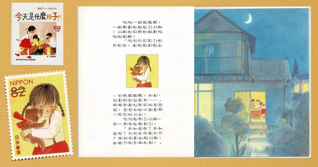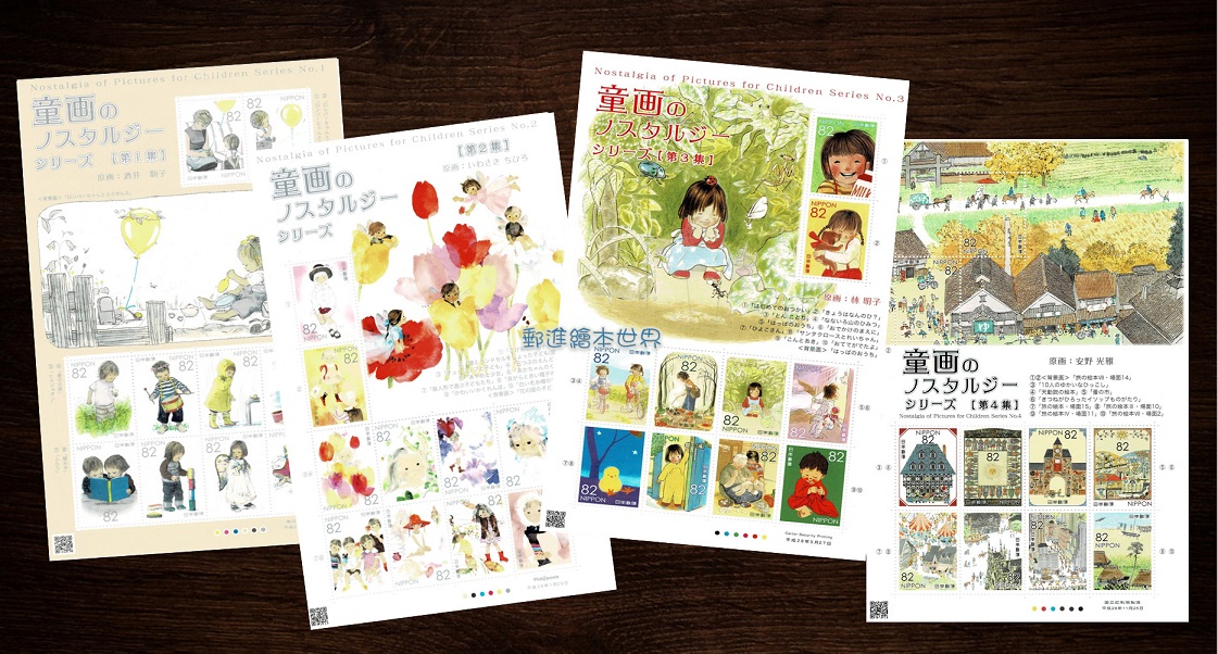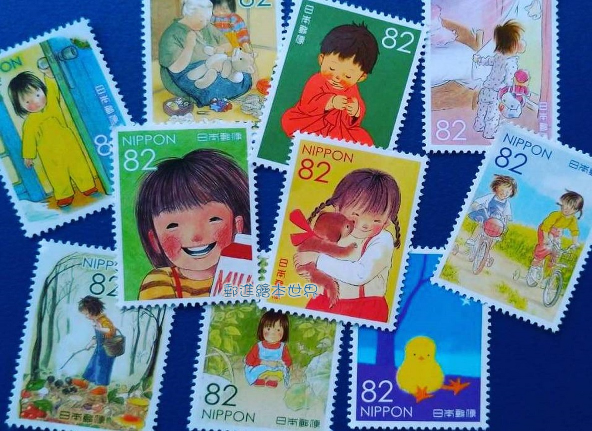 在你的童年回憶裡,最喜歡的或最令你懷念的繪本是哪一本呢?日本郵政局於2016年連續發行四集「童畫懷舊系列」(童画のノスタルジーシリーズ)特殊郵票(圖片2),依序以酒井駒子、岩崎知弘、林明子、安野光雅等四位日本知名繪本作家,以其暢銷作品分別印製各10枚紀念郵票。這四集郵票陸續發行時,皆造成郵票迷與繪本迷的搶購熱潮,而其中以第三集林明子的暢銷著作為主題郵票(圖片1),特別令我怦然心動。