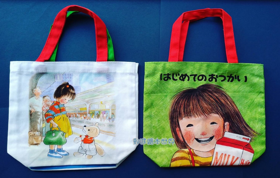 在與孩子們共讀《第一次上街買東西》(文:筒井賴子,圖:林明子,英文漢聲出版)時,則驚喜的發現畫面中所隱藏的許多細節,例如告示牌上,尋找虎斑貓的啟事,留下的電話正是當時福音館編輯室的電話;兒童畫室的老師正是「林明子」;小惠去買牛奶的雜貨店,是「筒井」商店;胖太太與戴墨鏡的叔叔不時在林明子其它作品「現身」等,林明子巧妙的埋藏進圖畫中的秘密,帶給我們許多閱讀的樂趣。尤其,寶貝們因此能鼓起勇氣走進便利商店,到貨架上拿起養樂多或者鮮奶,慢慢走到櫃檯付錢,展開人生第一次的「冒險」,面對陌生的櫃台阿姨、叔叔,也能勇敢回應。這些對於大人們輕而易舉的事情,對於幼兒來說卻是非常重要的成長體驗,於是《第一次上街買東西》成為我與孩子們特殊的閱讀經歷與幸福的記憶。事實上,在日本,也因為許多親子共讀過這本書後,颳起一陣小朋友上街買東西的初體驗旋風。而發行的周邊商品小提袋則貼心的適合幼兒小手拿取與購物使用。(圖片6)