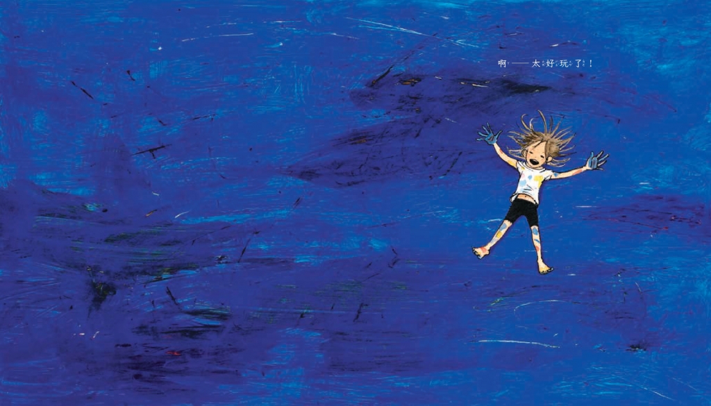 隨著內頁開展從「點」拉出「線條」,再迂迴曲折的纏繞了幾乎整個頁面,隨著不斷滴落的水墨加添色彩,然後在小女孩沾濕的雙手滑開而像雨水般渲染開來,並且手腳並用盡情的在畫紙上拍打踩踏,顏色、形狀和紋理層層疊疊,不斷交織,最後成了一片如海洋般的湛藍,小女孩躺在上面,宛如恣意徜徉在大海中悠游一樣。