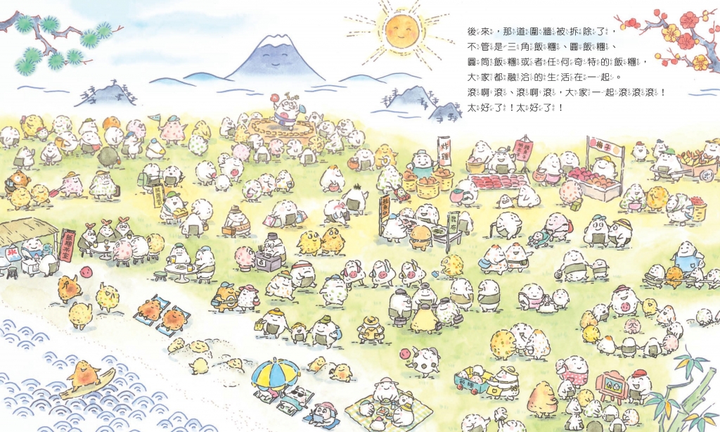 讀到這裡,作者充滿趣味與哲理的轉折設計,讓人忍不住「噗嗤」的菀爾一笑。「本是同根生」的概念在在說明了,哪有什麼誰輸誰贏?!作者運用飯糰的特質,在滾啊滾的過程裡,全都揉成一團啦!誰是三角飯糰?誰是圓飯糰?又怎麼分得出來,誰輸誰贏已經根本不重要!在滾啊滾的過程,是全盤皆輸,也是全盤皆贏,輸的是誰也不再是誰,贏的是大家都有重新再來過的新契機!