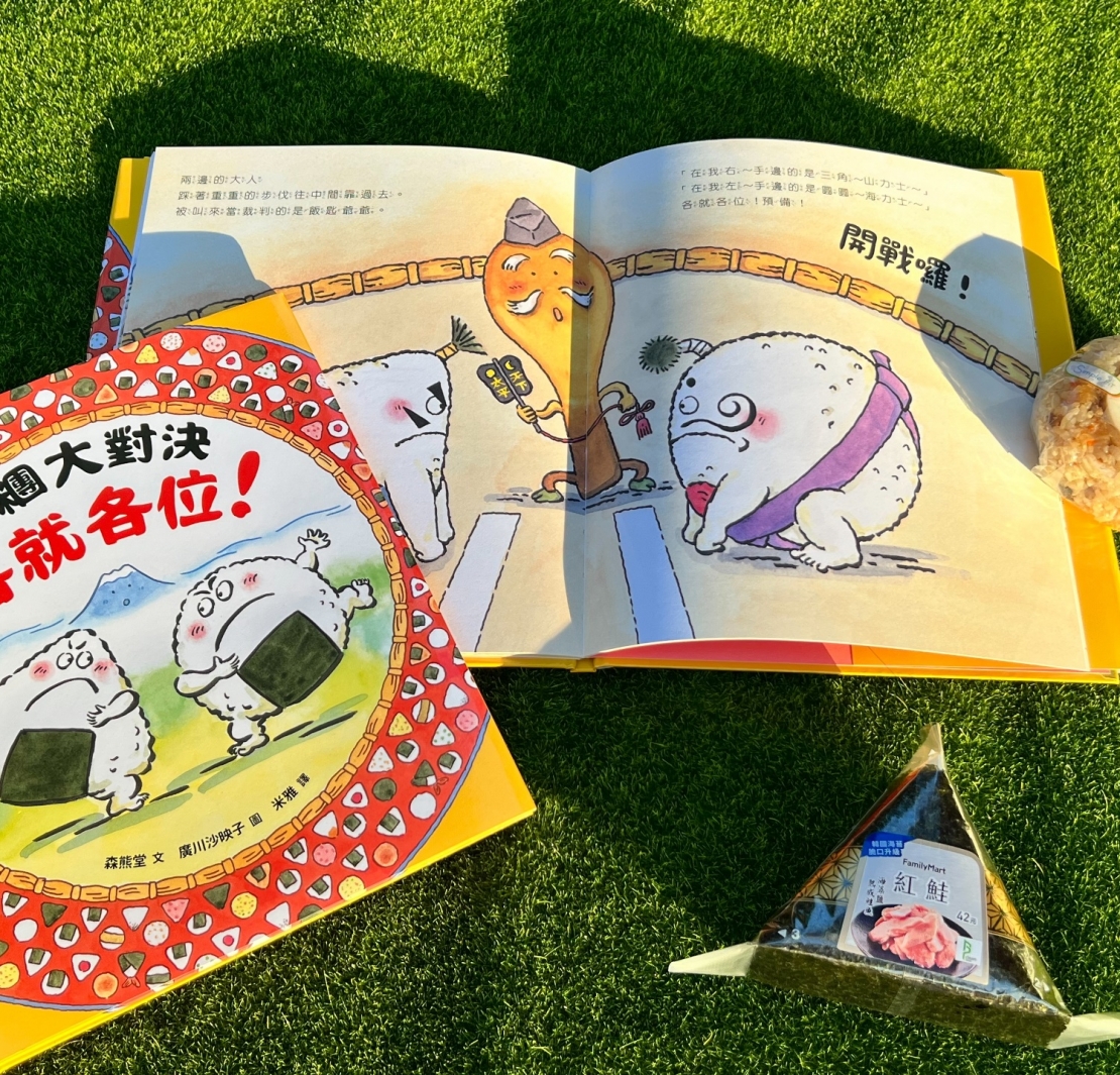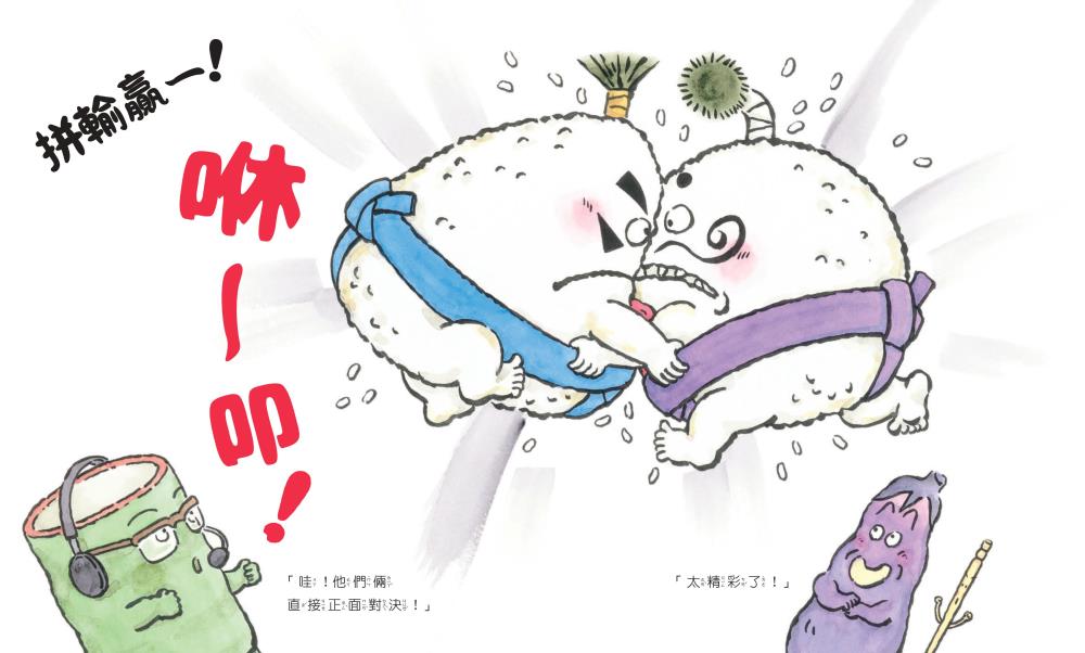 就生活中常見的飯糰為主角,童趣的筆畫塑造鮮活可愛的三角飯糰國及圓飯糰國,兩個國家彼此看不順眼,三角形飯糰自認堅挺又有原則,圓飯糰覺得如同太陽的「圓」才是最了不起!各有各有的想法與擁戴,總想一較高下,年輕三角型飯糰有稜有角的個性,把兩國之間的田地圍起來,阻擋圓飯糰的耕作,進而引發一場──飯糰大對決!