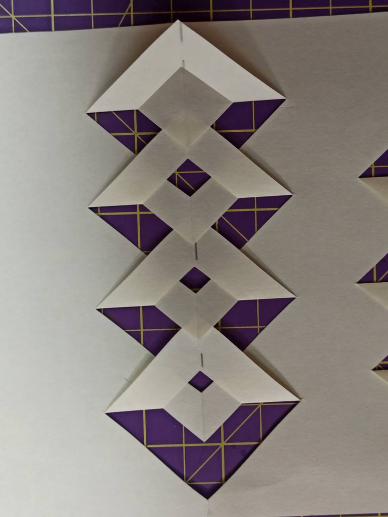 將剪好的紙張打開,間隔向上摺並插入上方(圖12-13),四個邊作法相同。
