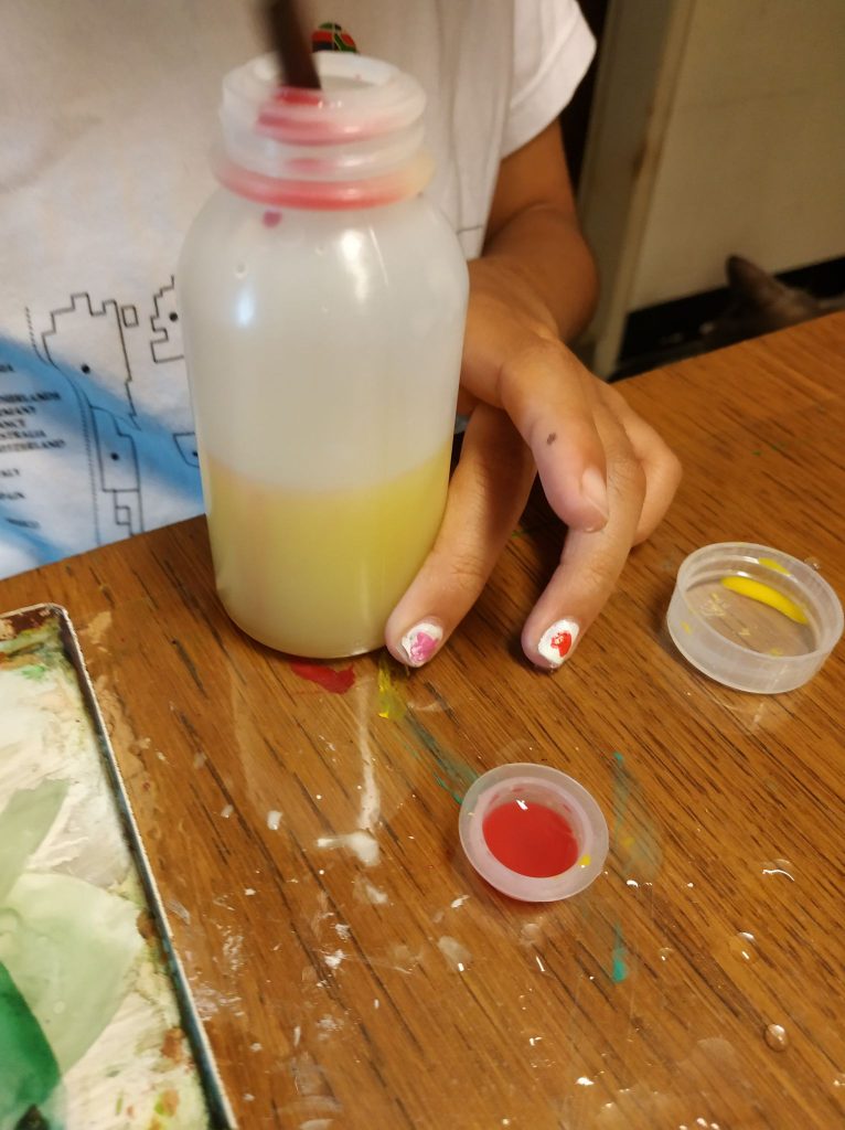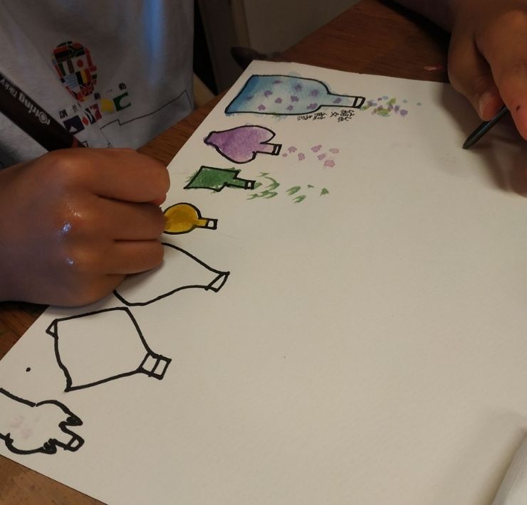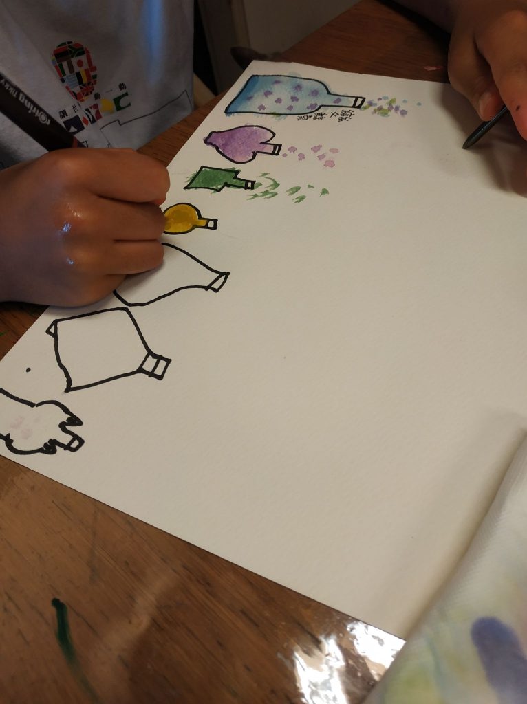 上誼文化出版的【神奇變身水】(圖3),故事從哇啦嗶哇囉鎮的巫師販賣一種可以變身的神奇變身水開始說起,而不快樂的小老鼠想要變身,郤無法決定要變成什麼,細想之後,發覺其實當一隻老鼠也沒想像中的糟……分享完繪本後的延伸活動1為讓小朋友畫出自已想變的動物;活動2則帶入水彩調色的遊戲,在水彩紙上先設計出各式各樣的瓶子,再利用水彩渲染技巧慢慢畫出各種屬於自己顏色的變身水(圖4),也可以準備數個塑膠瓶,讓小朋友練習調色,認識色彩的變化(圖5)。