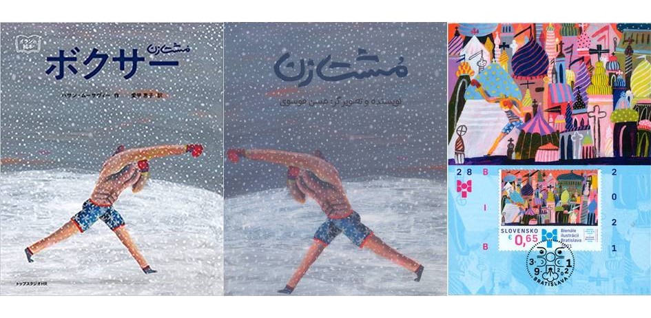現在正在舉辦「伊朗的繪本與襪子展」。繪本是剛出版的《拳擊手》,而襪子則是來自伊朗北部靠近裏海的襪子村,村裡的老奶奶們一針一針手工編織而成。Haassan Moosavi的《拳擊手》是2019年布拉迪斯拉瓦雙年展的大獎得主,不過封面實在太樸素,當初看到推文時並沒有太大興趣。