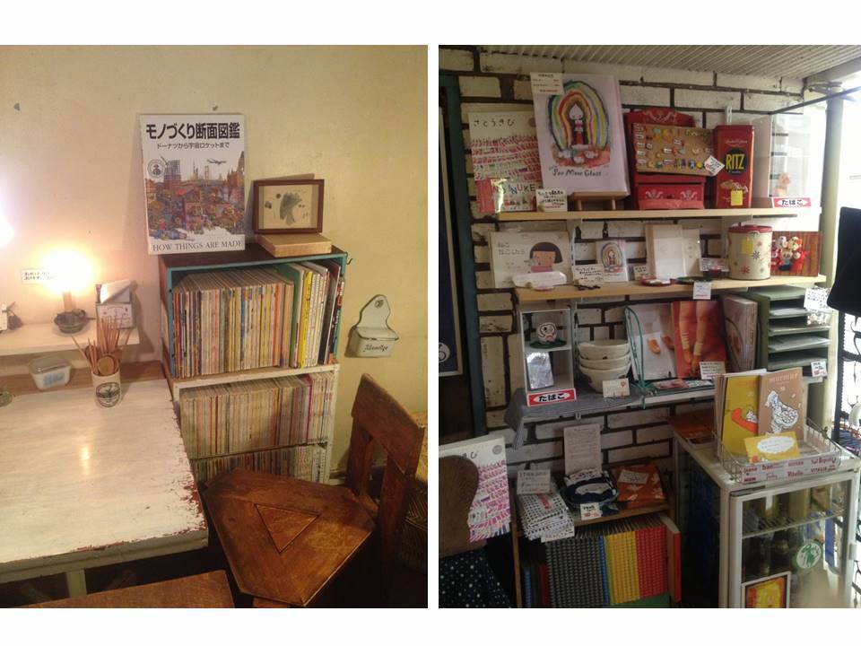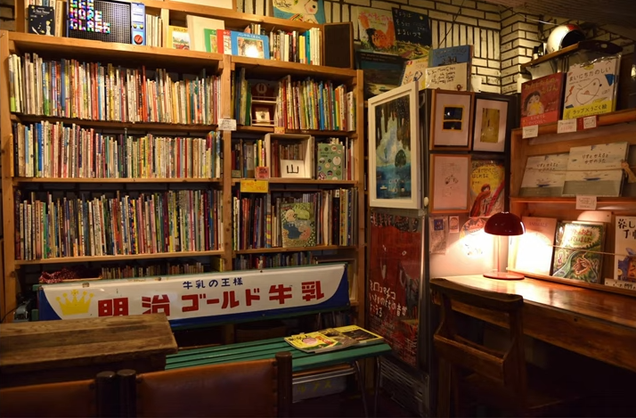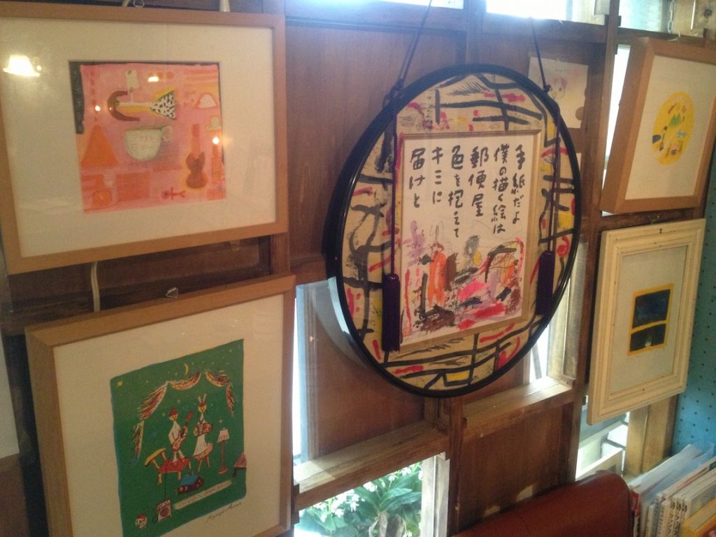 狹小的空間內,擺放了上千本繪本,但最引人注目的還是荒井良二設計的LOGO及插圖,散落在店內各處。牆上除了企劃展之外,還有荒井良二、植田真等的原畫。