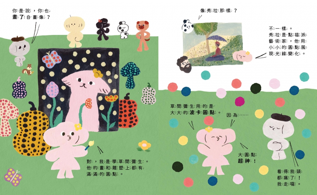 趣味流暢的故事情節,引人入勝外,更將各種畫風、技法,結合得很自然,閱讀過程裡,無形中認識了不同藝術家,舉凡畢卡索的多視點畫法、草間彌生的圓點設計、羅斯科的色域繪畫等等,都隨著皮皮的故事行進,拓展對藝術的欣賞與視野,甚至針對類似技法但不同畫家的差異說明,都在文字裡放進故事情感呈現,讀起來不會教條更不會硬梆梆,反而會有「哦~原來是這樣啊!」的體會與驚喜感。