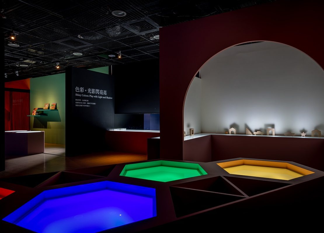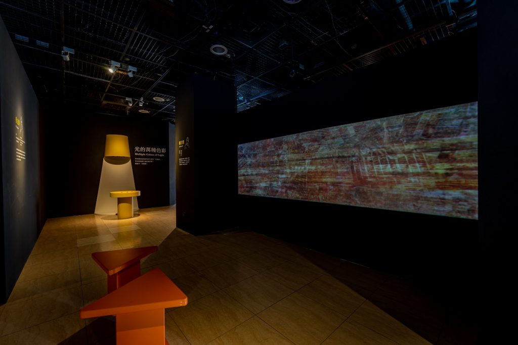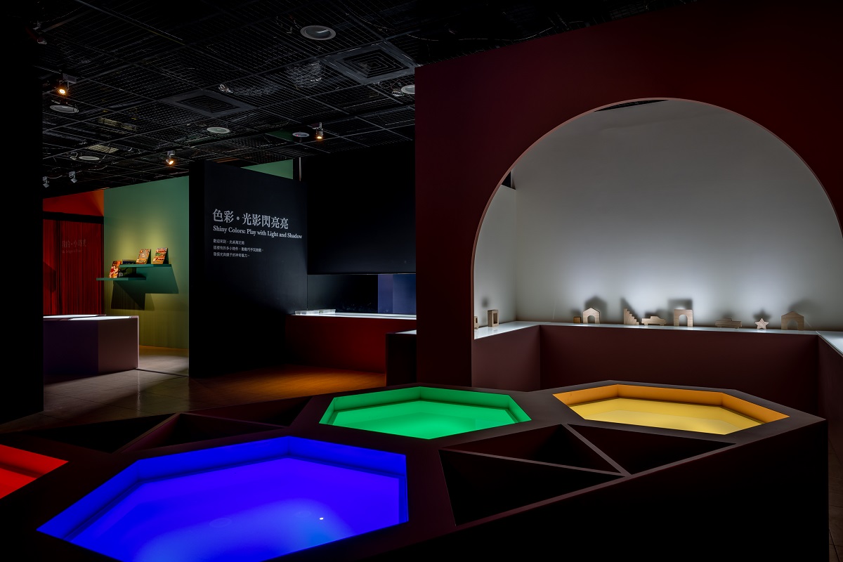 現在,從白天到黑夜,從天空到地面,各式各樣光的存在點綴大自然。「為什麼天空是藍的,晚霞卻是紅的?」「彩虹的顏色怎麼來」「月色的光芒源自何處?」這一切,歸根究底於「光是什麼」的大哉問。物理層面的光,牽繫著色彩,很長一段時間左右、啟發藝術的創作。於是,進入展場前,「看見光-光的奧妙趣味」知識牆,以簡潔的語言,描述物理的光、文學的光、照明史中的光等面向,擴延對光不同層次與層面的認識;觀眾可使用館方提供的玻璃紙材,做一把紅藍綠,光的三原色透光片,以單色片疊加,玩色彩的混合遊戲。三個固定顏色,色彩變化有限,為了讓兒童明白依不同比例混合光的三原色,將可以製造千百種色彩,展場二座趣味造型調光區,歡迎孩子動動手,玩實驗!