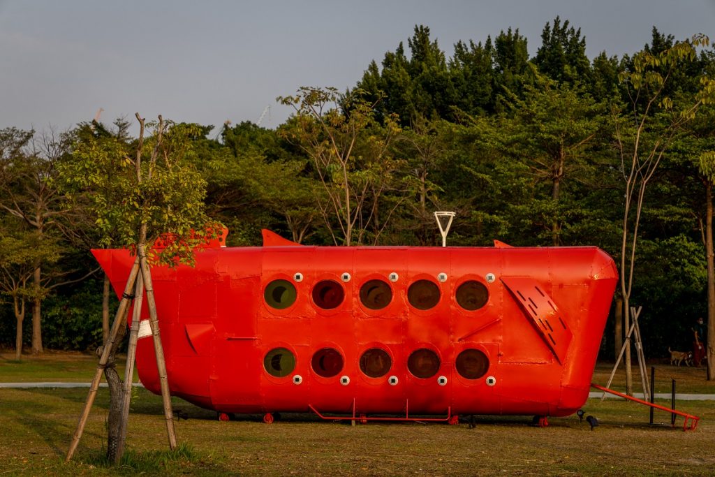 畢業於國立台北藝術大學新媒體藝術學系的李承亮,擅長處理回收材料,試圖在快速物質消費年代,將手工融入藝術。《時光旅行艙》是特地為現代人打造的一座精神載具。他說,原始造型靈感來自太空艙與潛水艇,而本次兒美館版本,特地參考古生物魚類,加上背鰭,色彩想法則採自鮮艷金魚。當觀眾走入幽微內部空間,聆聽電影中穿梭時光的配樂,讓它載著意識在奇異時光中漂移、飛翔。