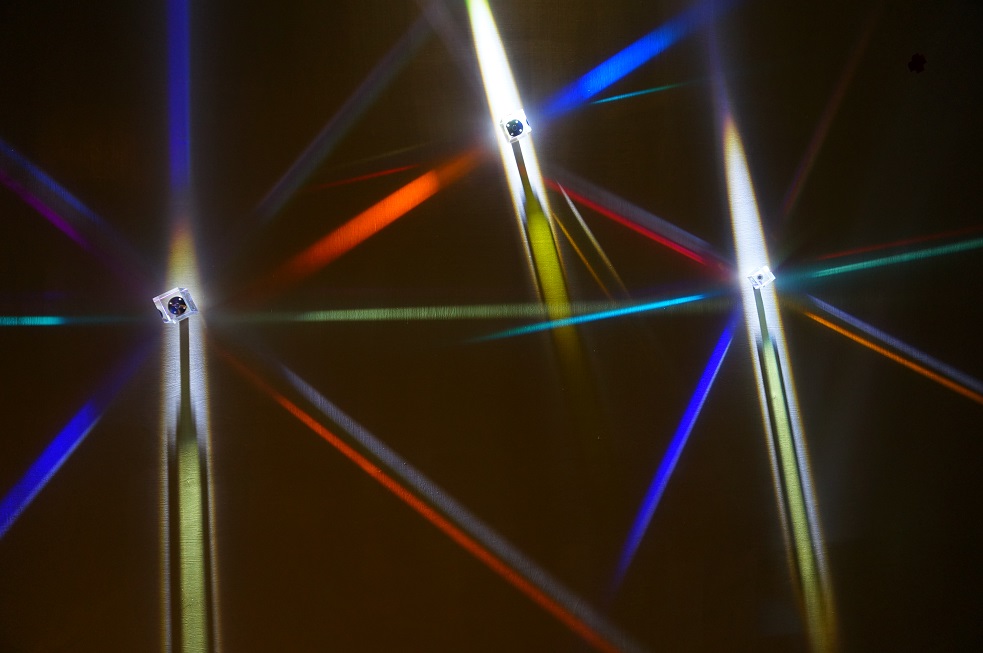 在此關鍵實驗中,牛頓確立白光是由7種顏色組合而成,當光穿透稜鏡,分解成光譜,相同的色彩折射角度固定,速度各異,蔡宜婷依此想像:「如果有一種介質可以慢下一道光,甚至可以捕獲它、將光分析,是否就可以留住一道虹彩?」她以相同造型大小各異的分色稜鏡為媒介,搭配不同轉速的動力裝置,使稜鏡旋轉呈現不同的色散效果,並在光芒四色的轉動中,又相互折射映照,顯現時間在色彩中流變。