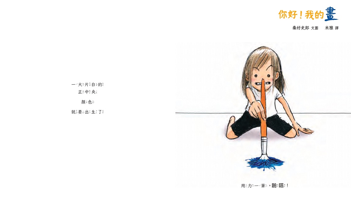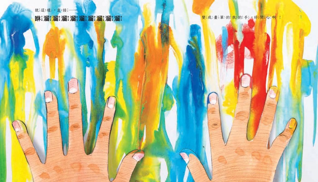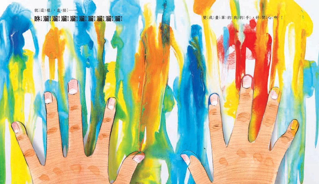 搭配的畫面,是個孩子,臉上有調皮的表情,還有一支「啪嗒」落在白紙上、沾了飽滿藍色的畫筆!在接下來的翻頁,就像音符在跳舞似的,依著文字詩意的節奏,又彎又跳、又點又躍!畫筆在紙上開口笑,擬人的敘述充滿童趣,擬聲詞的搭配讀起來更顯輕快活潑,白白的紙上有各種顏色,我們閱讀的眼睛和思緒,都跟著怦然心動,愉悅跟著一起啪啦、啪啦的大玩一番。