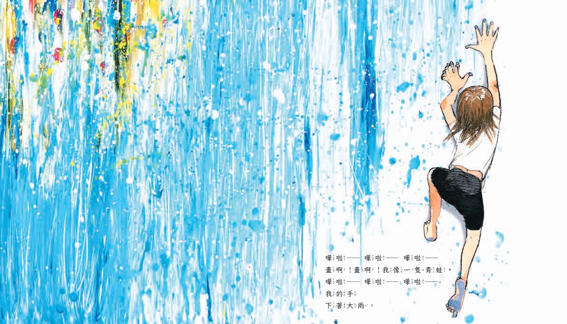 那畫畫可以怎麼畫呢?可以直線畫、彎著畫,可以用畫筆點點點,也可以用「滴」的、用「甩」的,不只用畫筆,雙手也很好;用沾滿水的掌心,在顏料的紙張上,趴著塗抹成一場藍色的雨,嘩啦啦!不只手,還有腳,秦好史朗在這裡將視角一轉,我們彷彿俯視著這個快樂的孩子,紙上滿是他的手腳印畫,讀者的心也跟著漲得滿滿的,好開心呢!