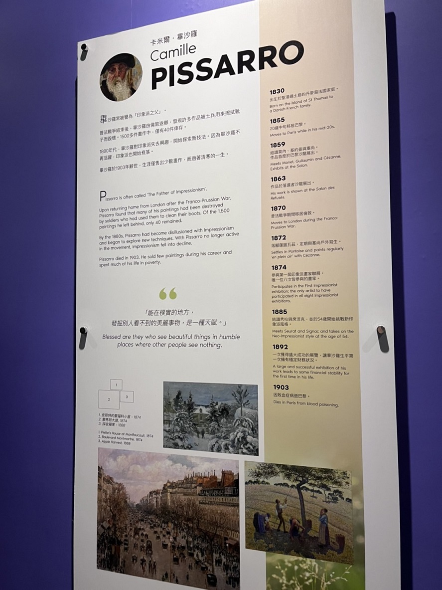 展區共分四大塊,前導介紹區介紹印象派主要風格、藝術家及重要代表作品,先奠定民眾對印象派的基礎認識。
