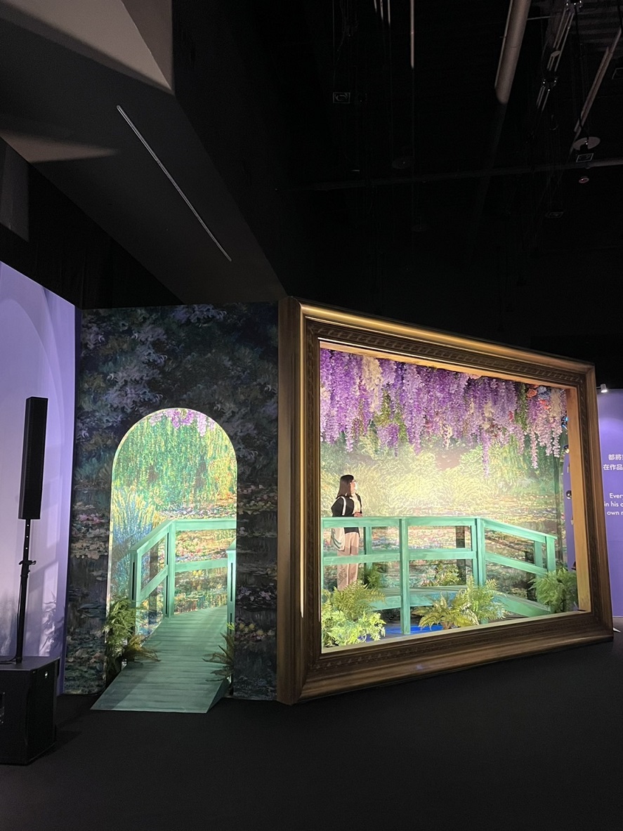 緊接著是莫內極富盛名的名作《睡蓮池上的拱橋》、《睡蓮》系列作品常看到的中日式步橋,實景重現莫內花園的田園風光,提供觀眾宛如置身名畫之中的想像。