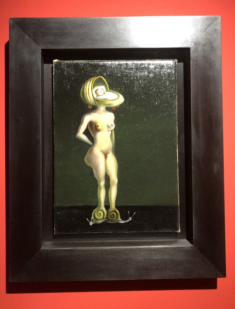 超現實主義的畫家們,就是在探索人心底那些被壓制的潛意識,因此在他們的作品中充滿了夢境般奇幻、詭異的情景,常將不相干的事物連結在一起,構成了一個超越現實的幻象。我也會舉例當時超現實主義畫家們喜歡玩的一種繪畫遊戲,類似「接龍遊戲」說明:由每個人輪流在紙上畫出某部分,畫完之後將有圖像處折疊(不讓下一位看到),最後打開就是一個共同組合而成的圖。於是,畫家們所看到有趣的影像,這就跟此次展場的展件《夢之舞》同樣的效果(而這幅畫也是達利在潛意識裡對紐約女性的觀察)。