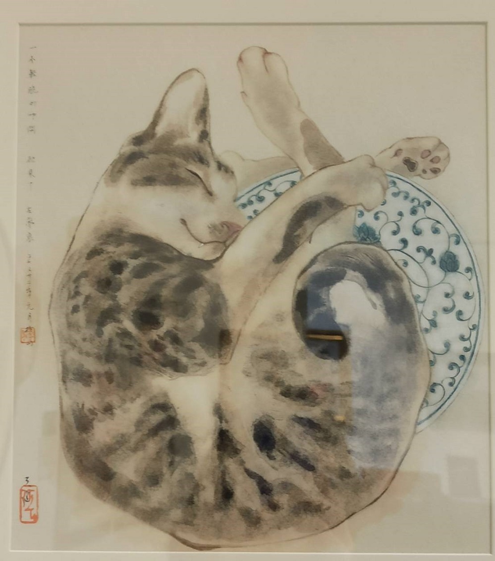 欣賞了展覽及歌劇表演,開始來玩藝術囉!貓蝶圖,貓蝶諧音耄耋,有長壽的寓意。這是國畫創作中常見的一個主題,貓蝶圖是根據這兩個字,一個是“老”、“毛”,“老”、“至”,就是“耄耋”,“耄”是七十歲的樣子,“耋”是八十歲的樣子,所以給老人祝壽的時候,送耄耋圖就是祝老年人健康長壽。近日在長歌藝術也看到藝術家張天健的貓碟圖,(如圖4)一隻貓神情愉快的抱著一個青花瓷碟,也許是貓咪吃飯的食器,用另一種形式來表現“耄耋”,也是一種創意的展現,若能在教學現場中讓學生們腦力激盪,也許能再創造出不同的“耄耋”組合。