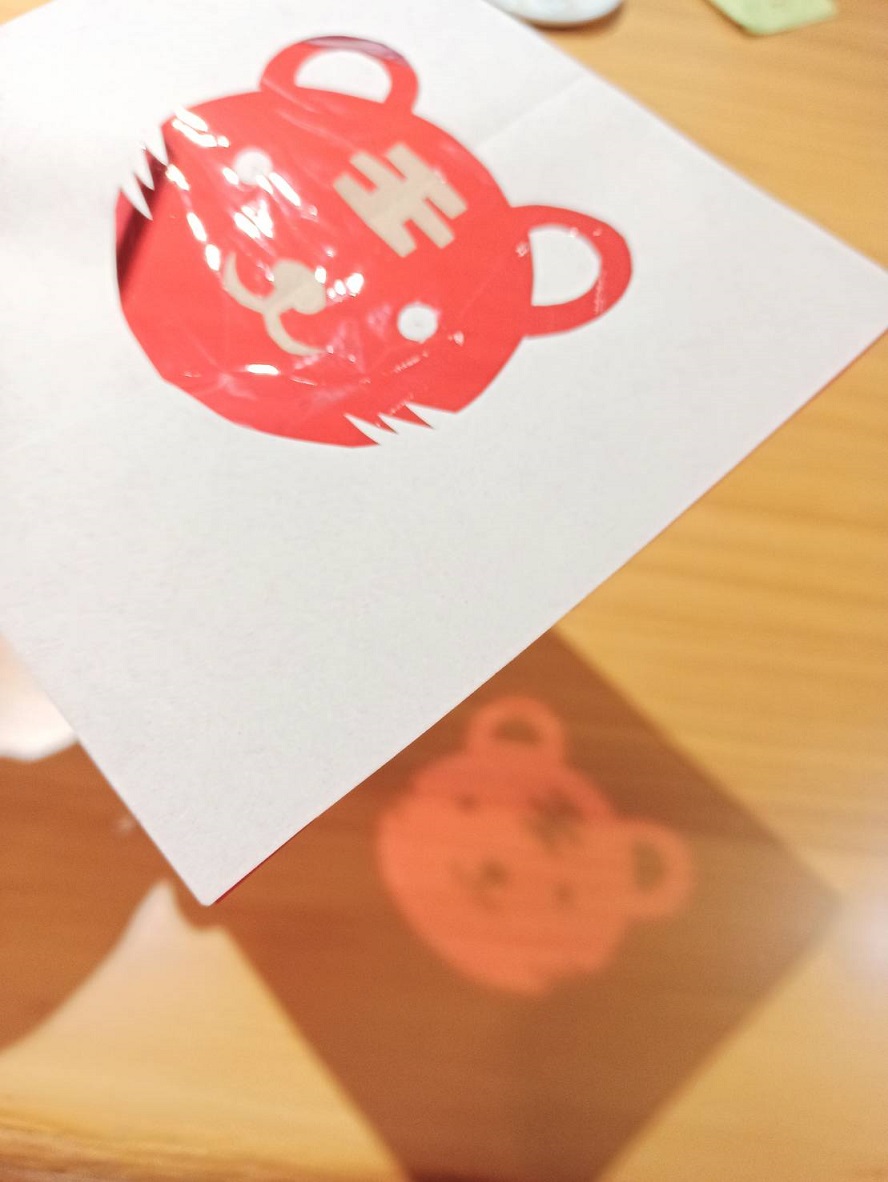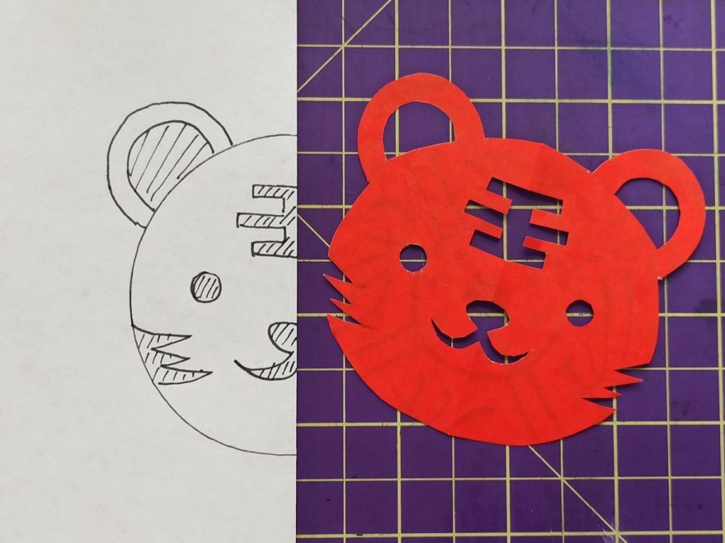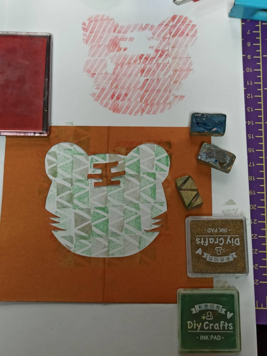 步驟6:剪下虎的紙張也別泿費喔!中間挖空的區域,可以利用蓋章或粉彩的方式來玩,先將橡皮擦利用美工刀割出線條等印面,再依序用印,搭配不同顏色的印泥,就可以創造出美麗的圖案,如圖12。若不想蓋印,也可以利用粉彩在挖空處塗抺按壓,就可以完成一件可愛的作品。