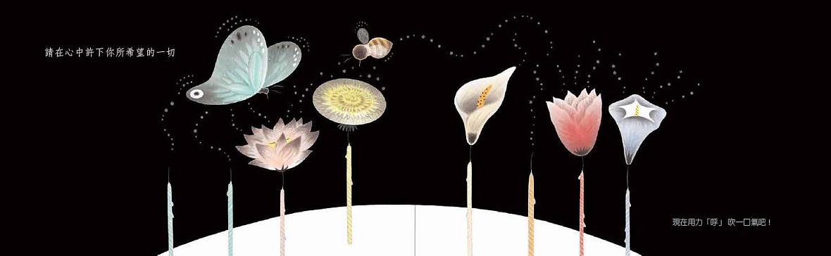 從一個點開始,到一隻翩翩蝴蝶,再來一朵又一朵不同姿態的花朵,都是作者經由設計,讓讀者「主動」帶著「期待」,親自動動手,而後迸發驚喜和收穫,這是一個互動性的閱讀歷程,箇中流動的是讀者的高參與度,都使得這本書除了故事,擁有了更獨特的閱讀心情。由白天到黑夜,圖像情境上的轉換,也讓氛圍從一連串驚喜所帶來的高漲情緒,進入一個浪漫安靜的時間流,然後,立體的翻翻設計,又將情緒拉抬,因為除了之前的點、按的動作,現在每個翻的動作轉換,又產生新的感受點,一種「真的收到禮物了!」的喜悅感!最後,「呼~」吹蠟燭,說聲「生日快樂」吧!