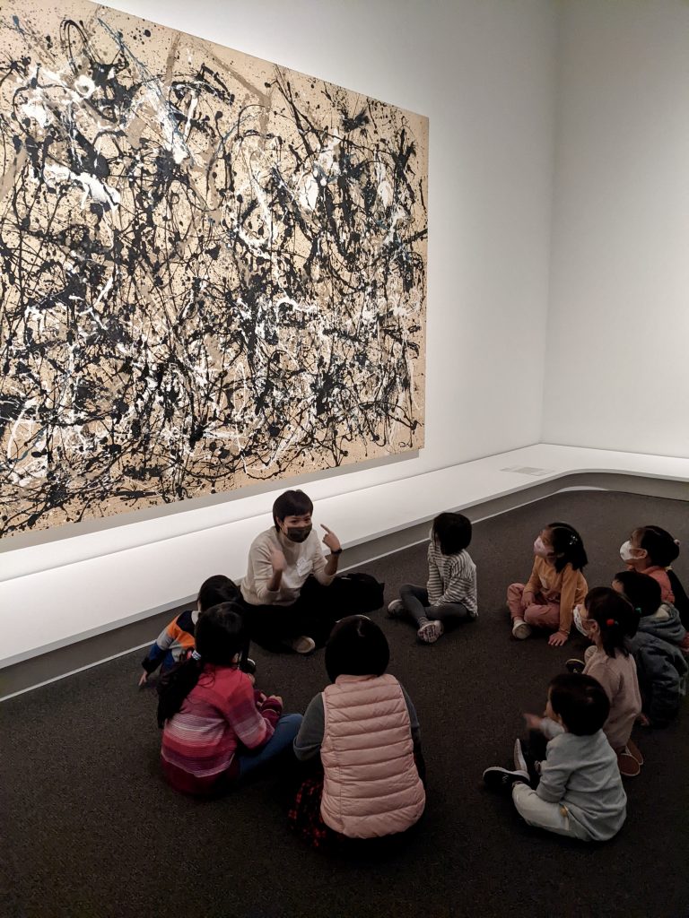 我們開始探索一件作品時,最常用的第一個問題是「在這件作品中你注意到什麼?(What do you notice about this work?)」(註)以 Jackson Pollock(傑克森·波拉克)作品 Autumn Rhythm (Number 30) 為例,小Q說他看到一堆螞蟻、小希說那些比較像是顏料滴在畫布上的痕跡,從他們的發言就開始對他們的過往經驗、既有知識、和思考方式有點概念了,接著就可以依據觀眾的發言去分享關於這件作品的資訊,並串連不同參與者的發言去引發更多的討論。