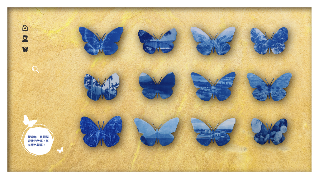 曹文瑞「心靈視窗系列」,以挪用及拼貼的手法將真實的風景經過重組,將景色塑造成類似劇場的佈景一般,以此概念揶揄、反諷人類一直想要改變自然與大自然對抗的自大心態,本次策劃邀請他將旅途意象融合在繪畫中,以流行符號反思人類與自然之間的關係;劉子平「藍色蝶道」以氰版藍曬為主要創作材料,將臺灣特有的紫斑蝶遷徙生態作為「遷移、多元與海島性」之隱喻,本次邀請藝術家轉化其作品,將蝴蝶的雙翼皆以氰版感光印上藝術家親身環島踏查所攝影的風景片段,如同海島多元的文化與移民性格,由此匯集台灣島歷時至今的集體記憶,將蝴蝶的遷徙特質和棲息的多樣性與氰版攝影創作結合,引領觀者跟循蝴蝶的飛行路線,線上閱覽豐富的景觀。