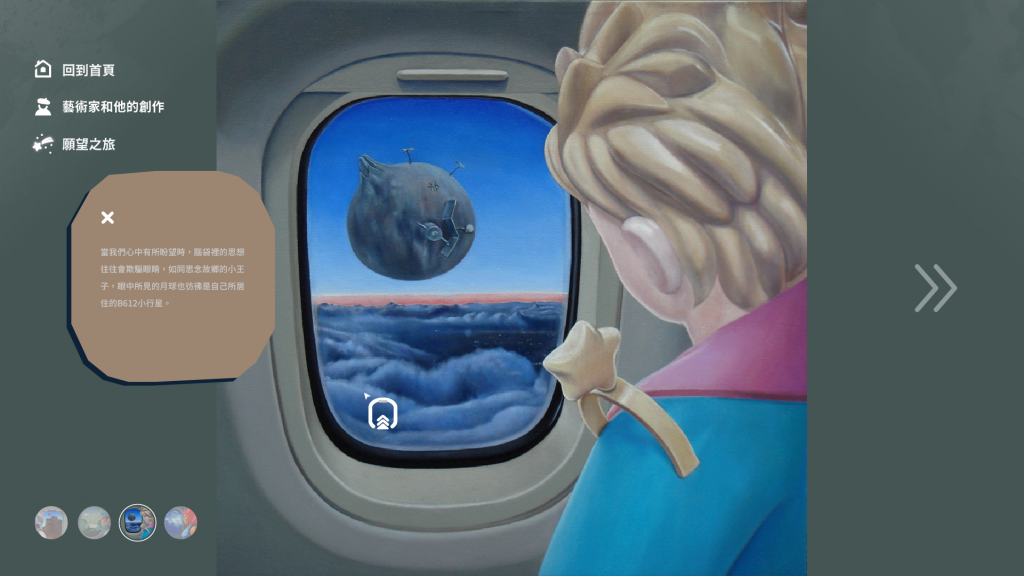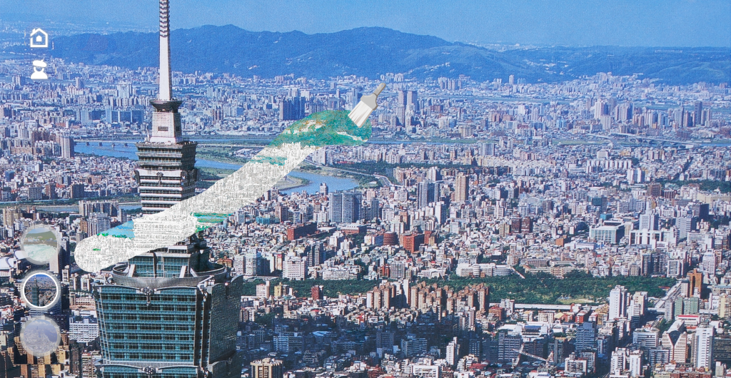 王昱翔結合繪畫與網路地圖系統,轉換觀看臺灣島嶼的視角,他認為「任何一張地圖都不是客觀的,都涉及特定的觀點。」透過 Google Earth 環繞臺灣觀看臺灣島,帶領藝術家至海外的客觀角度,找尋臺灣島的主體;洪天宇邀請孩童以筆刷將鳥瞰風景褪去,象徵人類文明褪回自然景觀,引發體驗者對自然的關注與思考;范揚宗「造飛機系列」匯聚了飛機、天空,與地面等不同方位的視角,凸顯出「我們身在何處的思考」,進一步引發觀者對於習以為常的空間進行反思,他繪畫呈現多重視角的飛行,觀者透過「操作飛機」的視覺體驗,感受乘坐飛行器時特有的重力經驗。