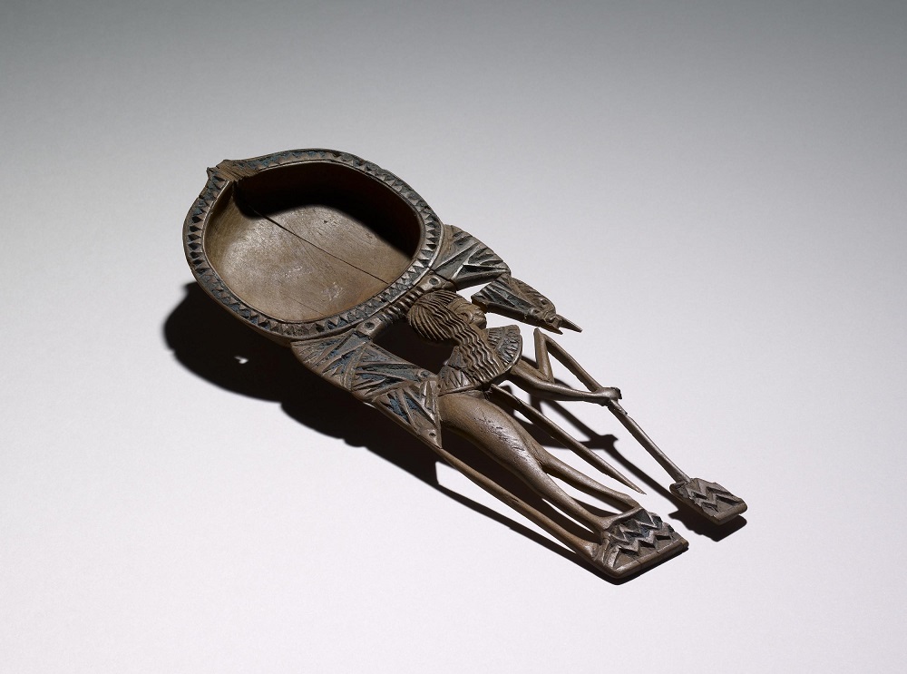 喝咖啡最適合搭配甜點享用了,讓我們到古埃及展區找個特別的湯匙使用吧~據說眼前這支來自古埃及新王國時期的木製湯匙已經三千多歲了!除了宛如桃子形狀般的湯勺之外,仔細一瞧,它的握柄竟然是位戴著耳環、披著美麗長髮、被沼澤植物環繞的年輕女孩,握柄最底下還刻著象徵水流的圖騰,不知道彎著腰的她是在嘗試過河,還是幫忙做農事呢?