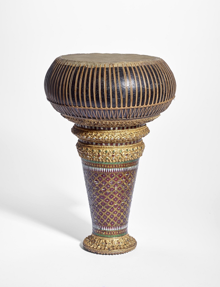吃飽之後,來聽點助興音樂吧~「咚、咚、咚!」動感的節奏與樂音從眼前這個精緻的鼓發出來,作為泰國傳統敲擊樂器的它可以被分為兩個部分,上半部黑色圓弧形狀的是鼓身,一條條細長的竹繩將作為鼓面的蛇皮牢牢綁住。聽說蛇皮不僅富有彈性,還能夠讓鼓聲更加清脆。另外,蛇對於泰國人來說也有神聖的意義,他們將蛇視為神明,還有各種與蛇相關的節日。下半部則是支撐鼓的陶瓷支架,上寬下窄的造型有點像運動比賽時使用的加油棒。不過你注意到了嗎?這個鼓架上面使用了閃亮的鍍金裝飾,以及宛如珠寶一般的紅綠色裝飾,不由得讓人想像演奏這樂器的場景,是不是盛大又華麗呢?
