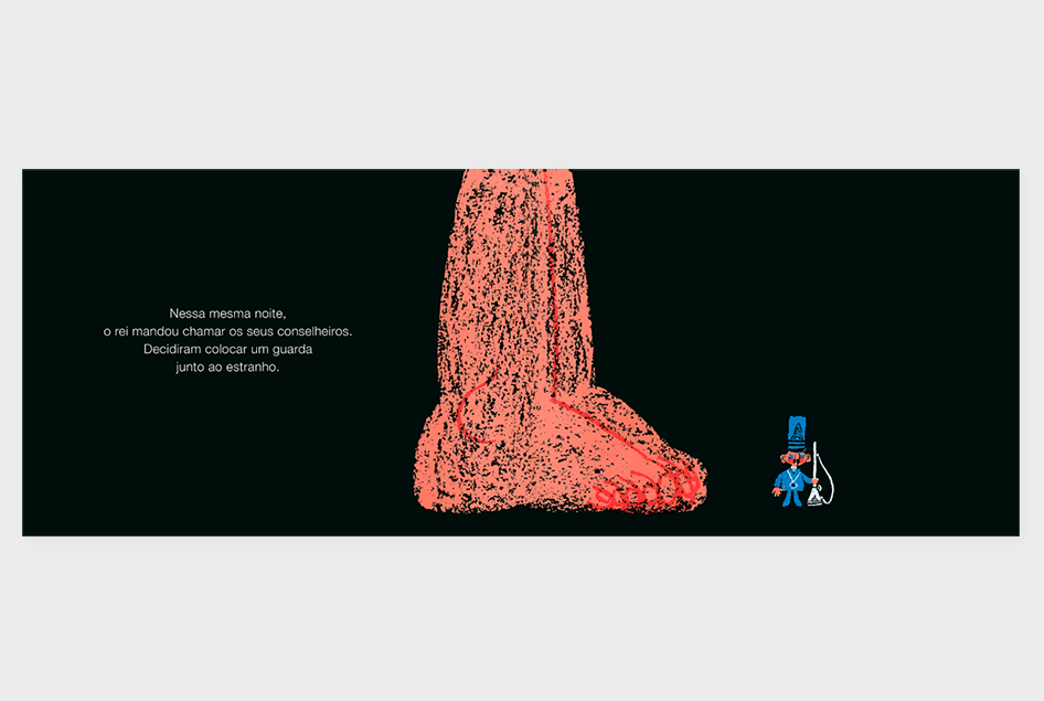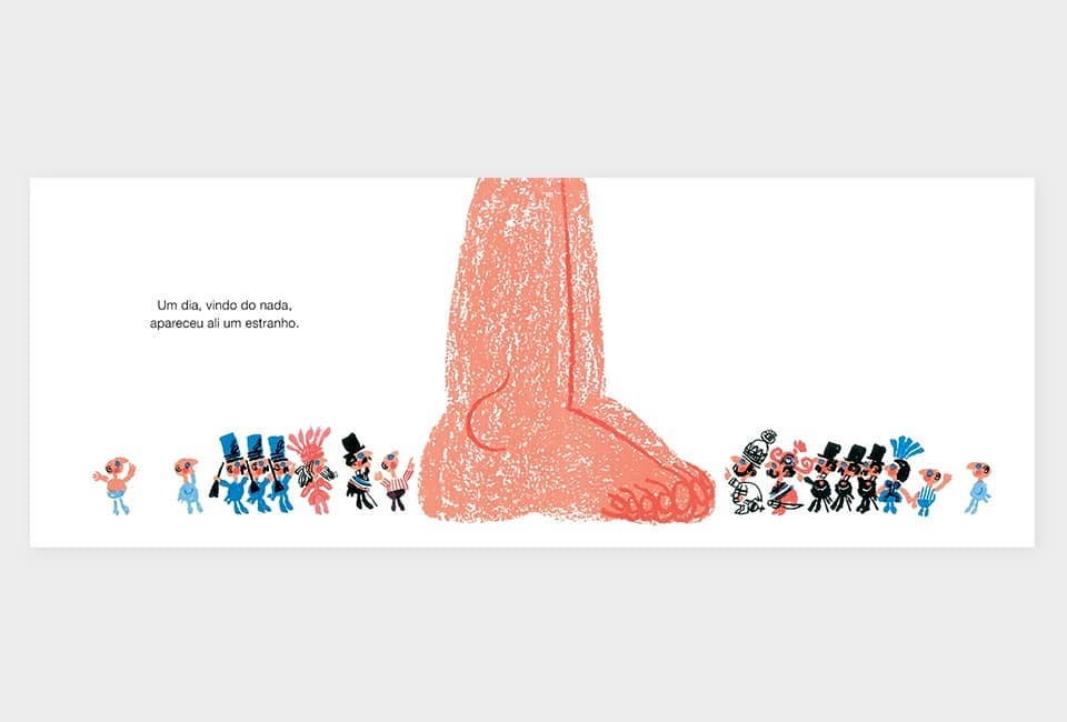 《異類》(“O Estranho”, 出版:Bruaá Editora),故事說有一個國家,某天來了一位巨人,國王和子民沒辦法跟他溝通,於是就發動不同程度的攻擊。在重型武器(砲彈)攻擊之下,巨人哭了,哭到淹沒大地,大家都漂在了水面,視線終於在一條線上,可以好好說話了。啊,原來國王最想說的那句話是⋯⋯